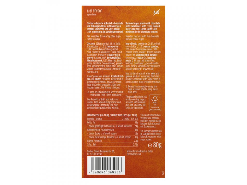 xylitol 29,3%, kakaové máslo, kakaová hmota, prášková smetana 11,5%, isomaltózové křupky 10% (sladidlo 98% isomalt, odtučněný kakaový prášek, přírodní aroma), odtučněné sušené mléko 9%, přepuštěné máslo, lískovo oříšková pasta, 0,5% mořská sůl, emulgátor (slunečnicový lecitin), mleté vanilkové lusky, přírodní vanilkové aroma.