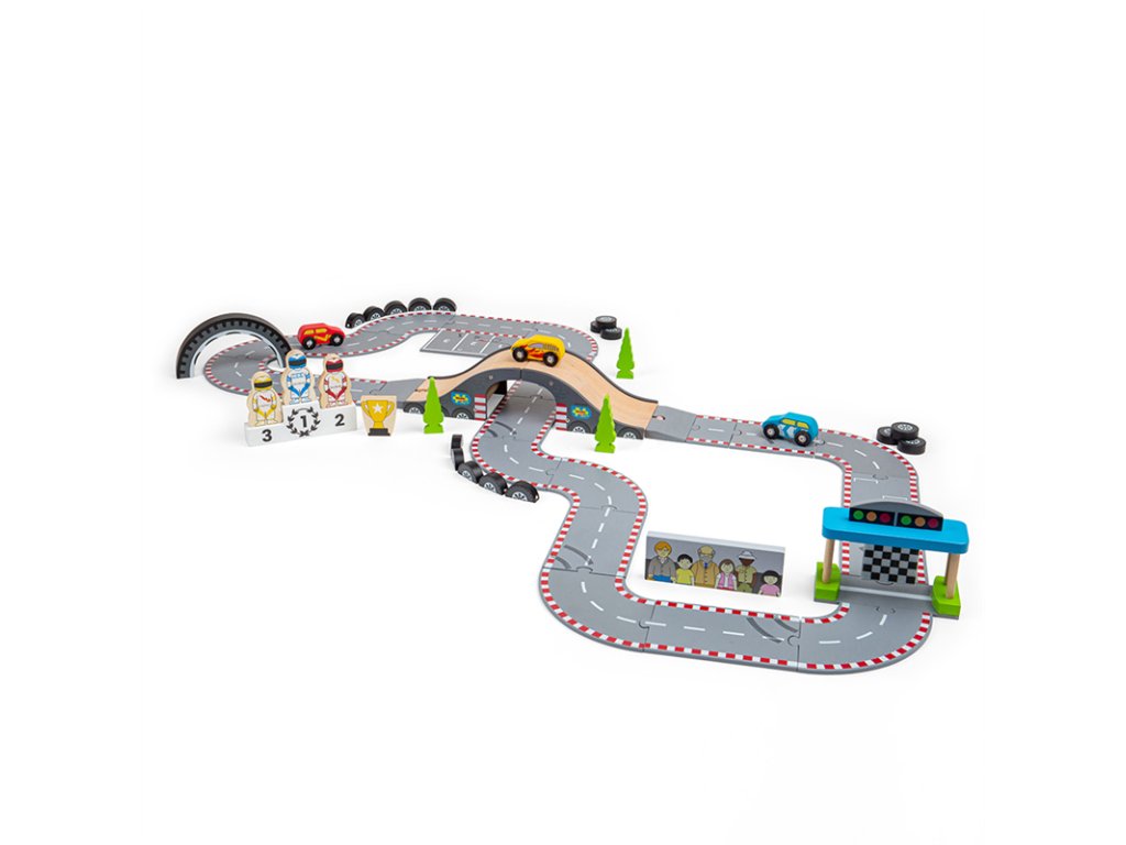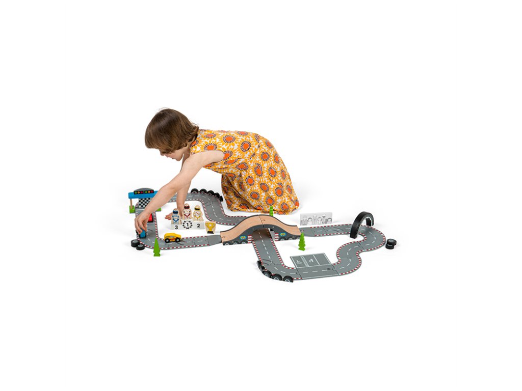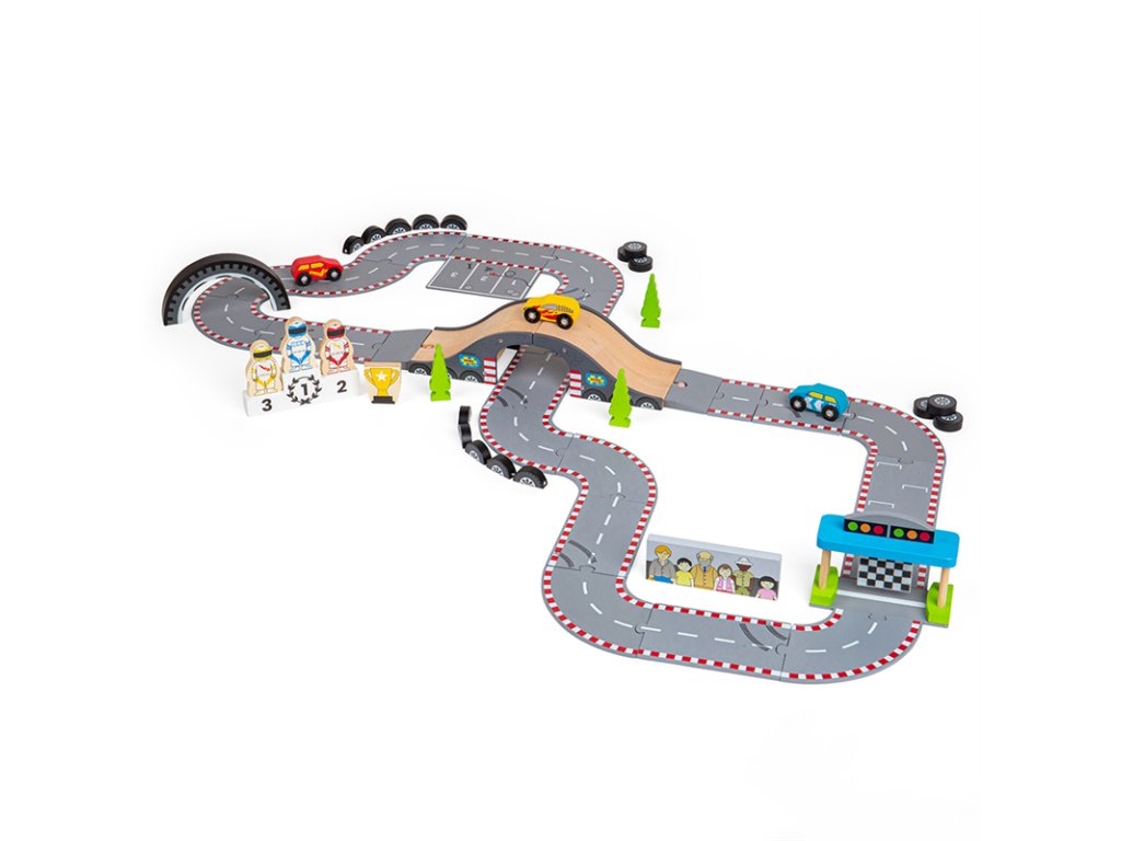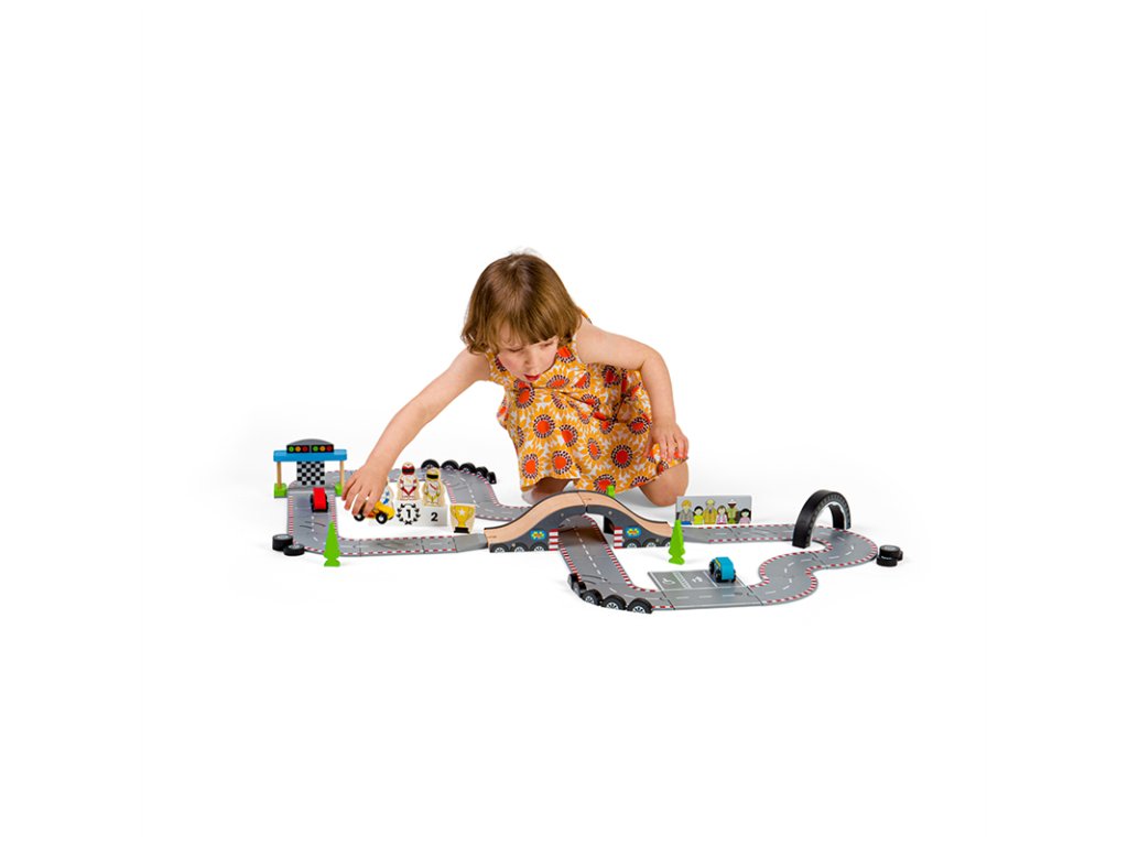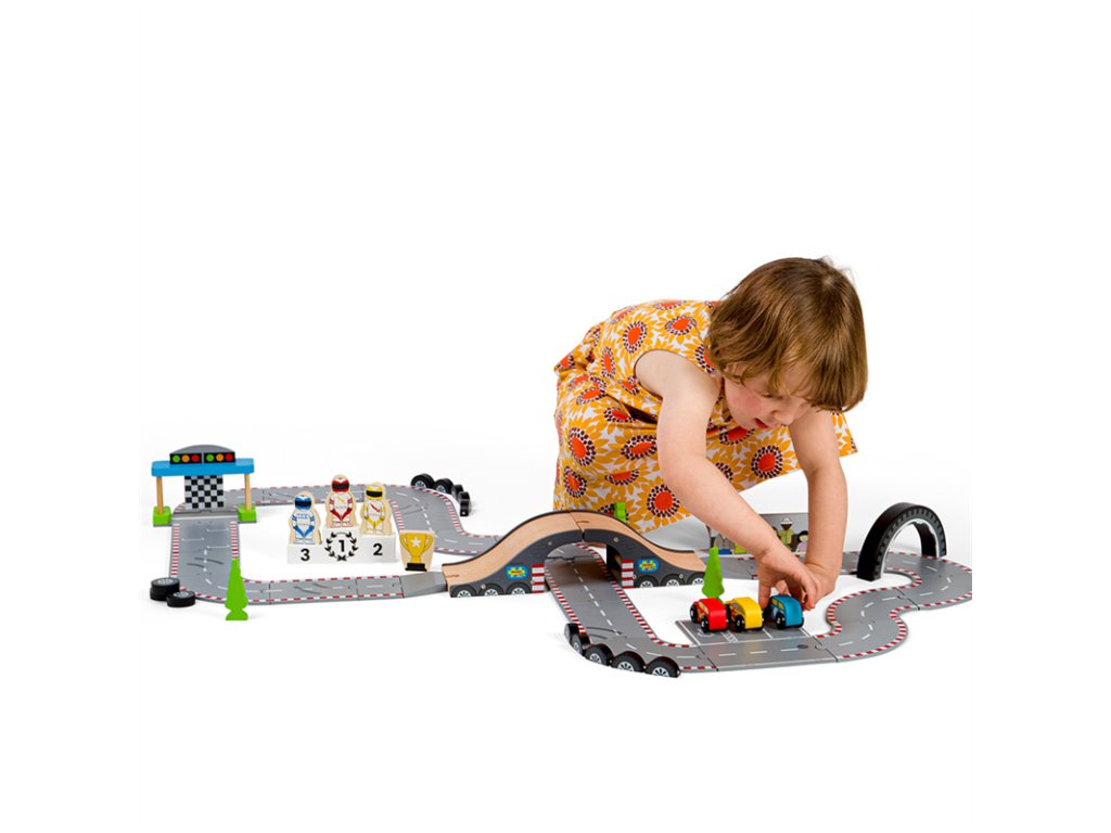 Připravit! Pozor! Start! Tato fantastická dřevěná autodráha Závodní den je ideální dárek pro každého malého závodníka, nebo závodnici. Obsahuje řadu dřevěných silníčních dílů, 3 závodní auta, start/cíl a další příslušenství, což umožňuje dostatek prostoru pro zábavnou a kreativní hru. Lze ji použít s dalšími sadami Bigjigs Rail silnicemi a rozšířit tak rozmanitost herních aktivit. Lze kombinovat i se všemi ostatními dřevěnými silničními sadami na trhu. Rozvíjí koordinaci pohybů, jemnou motoriku, zručnost a představivost. Vyrobeno z vysoce kvalitních, zodpovědně získaných materiálů. Splňuje aktuální evropské bezpečnostní normy. Hlavní vlastnosti: 47 dílná dřevěná závodní dráhaobsahuje 3 závodní auta, 3 jezdce, pódium pro vítěze, hlavní tribunu, bariéry, semafory stromečky, pohár pro vítěze, nadjezd a díly závodní traťepodporuje představivost, obratnost a koordinacivhodné od 3 letDoplňkové parametry