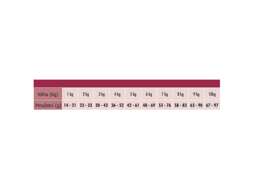 Analytické složky: hrubý protein 31,00 %, hrubá vlákna 3,00 %, hrubý tuk 12,00 %, hrubý popel 9,50 %.