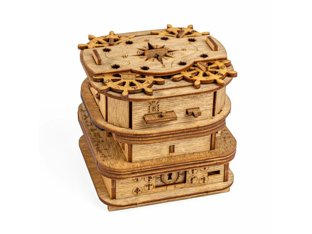 Už žádný nudný balící papír! Věnujte dárek s překvapením a zažijte strhující zábavu Chcete darovat peníze, šperk nebo jiný drobný dárek? A chcete předat dárek skutečně originálním způsobem? Spojte překvapení se zkouškou důmyslu a trpělivosti. S hlavolamem v inovativním designu vyrobeným z březového dřeva neuděláte chybu. Nenechte si ujít vzrušující zážitek ze hry. A nemusíte si hrát sami, zapojte celou rodinu nebo přátele. Hlavolam je pečlivě vyroben z přírodního materiálu a všechny jeho části byly přesně vyřezány nejlepší laserovou technologií. Příběh:Londýn, 1720. Ian Kensington, kapitán britských inženýrských sil, je zodpovědný za první úspěšné obnovení potopené lodi. Ve zprávě pro Jeho Veličenstvo anglického krále Jiřího I. Kensington poprvé zmiňuje skříňku Davyho Jonese. Přestože se jedná o skutečný artefakt, popisuje skříňku v kontextu legendy o mořském ďáblu Davy Jonesovi, který údajně zamyká zbloudilé duše všech námořníků, kteří na moři přijdou o život. Říká se, že na každé potopené lodi skrývá repliku skříňky a slibuje, že propustí všechny duše, pokud se někomu podaří skříňku otevřít. Od prvního nálezu byly podobné skříňky nalezeny ve vracích lodí roztroušených po celém světě. Některé z nich jsou dodnes uchovávány v soukromých sbírkách, jiné v muzeích. Jejich tajemství se však zatím nikomu nepodařilo prozradit. Jsme si jisti, že jste to vy, kdo konečně bude moci otevřít skříňku a donutit Davyho Jonese přiznat svou porážku! Hlavní vlastnosti: 72 dílkůdoba hry 60-90 minutvyrobeno z vysoce kvalitního březového dřevapro 1-2 hráčetajný prostor uvnitřkreativní dárkové balení pro malý dárekopakované použitívhodné od 14 let Jak hrát:Krok 1Řešte úkoly jeden po druhém, dokud neodhalíte tajný prostor. Krok 2Pokud si nebudete vědět rady, podívejte se na tuto webovou stránku. Krok 3Na konci dobrodružství na vás bude čekat překvapení a možnost zvěčnit své jméno na zdi slávy. Krok 4Po otevření hlavolam můžete znovu zavřít a předat dál, ať si zábavu užijí i ostatní. VAROVÁNÍ! Níže uvedená videa obsahují spoilery řešení! Prosím, sledujte pouze první 2 minuty, pokud si chcete užít hádanku a vyřešit hlavolam sami.Doplňkové parametry