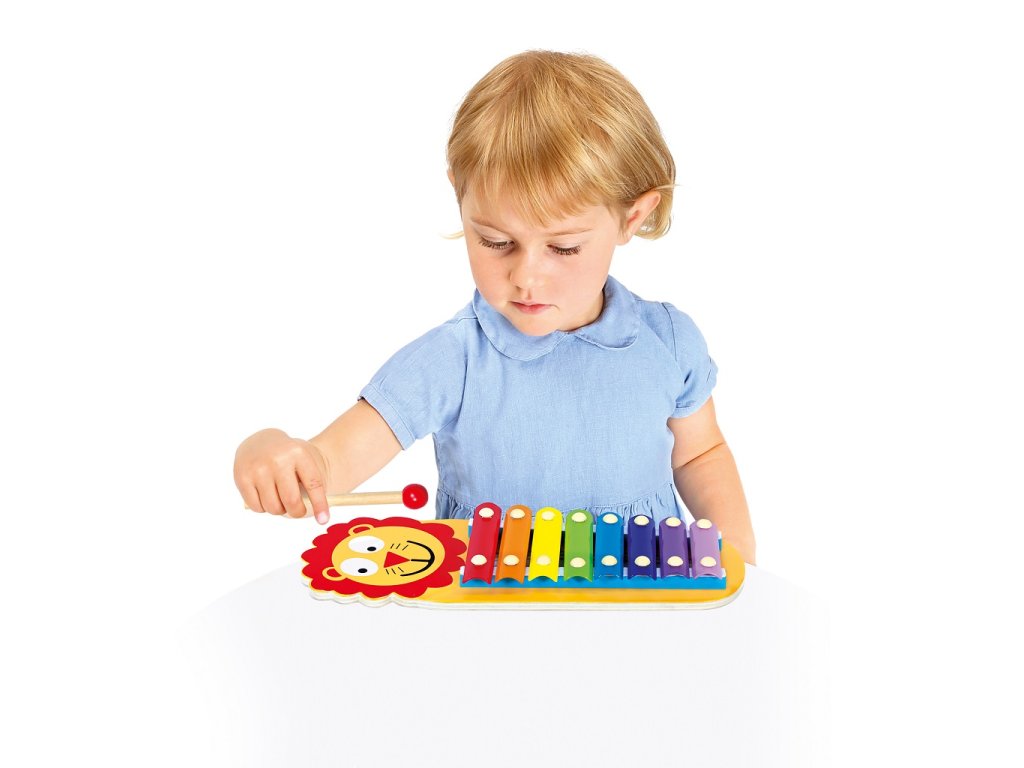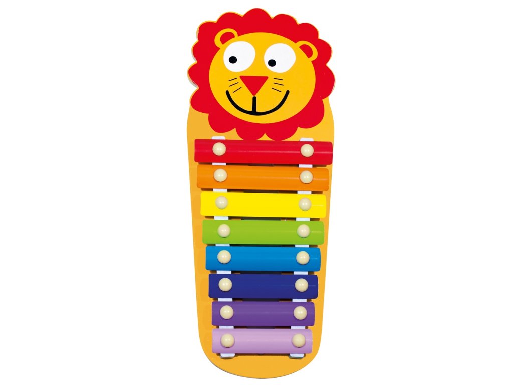 Dětský xylofon s motivem lvíčka. 3-dílná sada s 8 kovovými zvukovými pláty, které nabízejí hraní v plném rozsahu. Xylofon nabízí dětem příležitost seznámit se se základy hudby a rozvíjet svůj hudební talent. Je tak ideální hračkou pro první dětské hudební kroky. Ošetření nezávadnou barvou, zaoblené rohy a hladké povrchy zajišťují bezstarostné hudební chvilky. Vhodné pro děti od 18 měsíců. Varování! U dětí do 18 měsíců používat pouze pod dohledem dospělé osoby. Hlavní vlastnosti: 3 dílná sada8 zvukůrozvíjí hudební talentParametry produktu:
