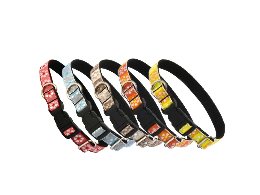 Pevný a kvalitní popruhový obojek. Z vnější strany ozdobený barevnou stuhou s dekorem kytky.