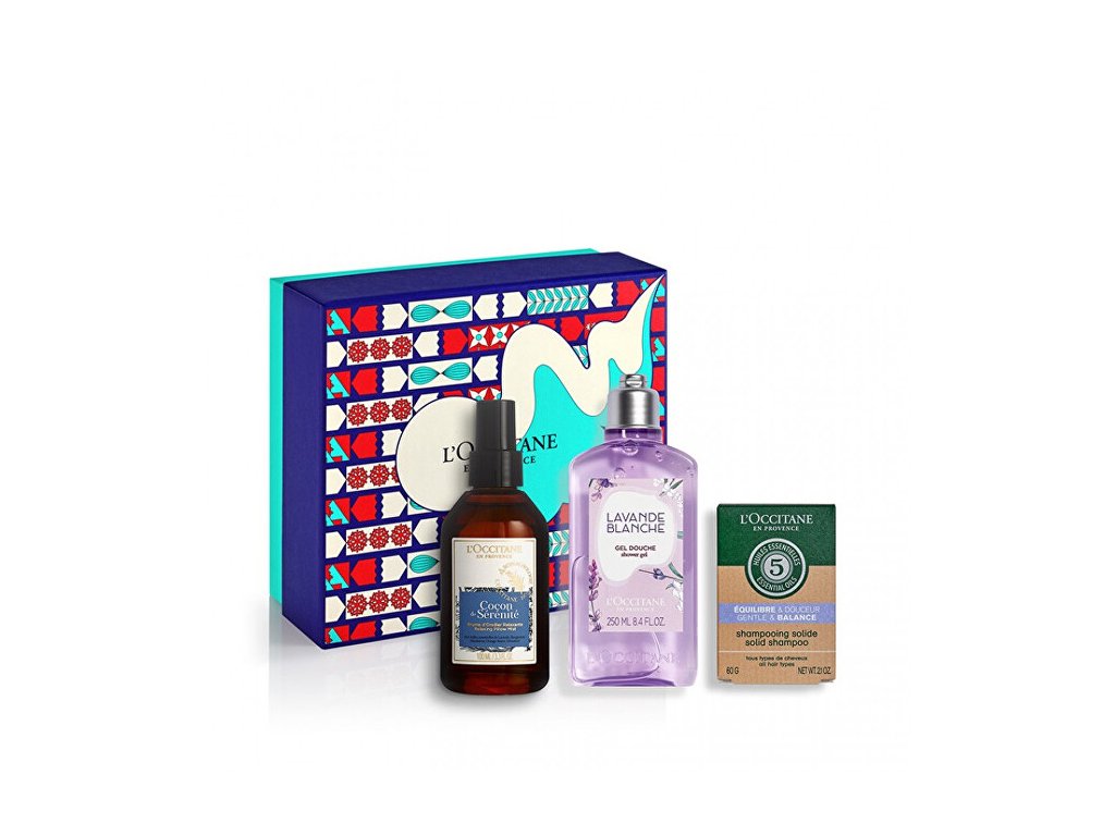 Sada obsahuje: Sprchový gel Lavande Blanche (Shower Gel) 250 ml Jemný tuhý šampon Gentle & Balance (Solid Shampoo) 60 g Relaxační sprej na polštář (Relaxing Pillow Mist) 100 ml