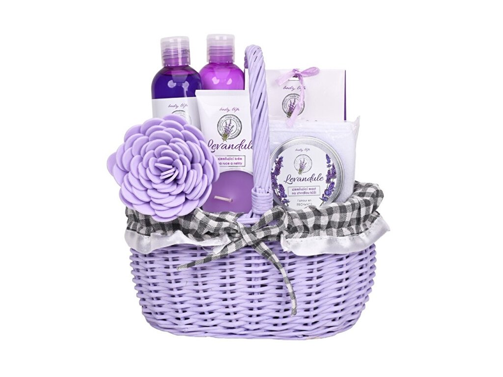 Krásné dárkové balení voňavé levandulové kosmetiky v dekorativním proutěném koši. Dopřejte sobě a svým blízkým příjemné chvíle relaxace s kouzelným nádechem Provence. Dárkové balení obsahuje: Sprchový gel a šampon 250 ml Tělové mléko 250 ml Sůl do koupele 80 g Zjemňující mast na ztvrdlou kůži 100 ml Krém na ruce 100 ml Čajová svíčka Kosmetická čelenka Masážní žíňka Proutěný koš