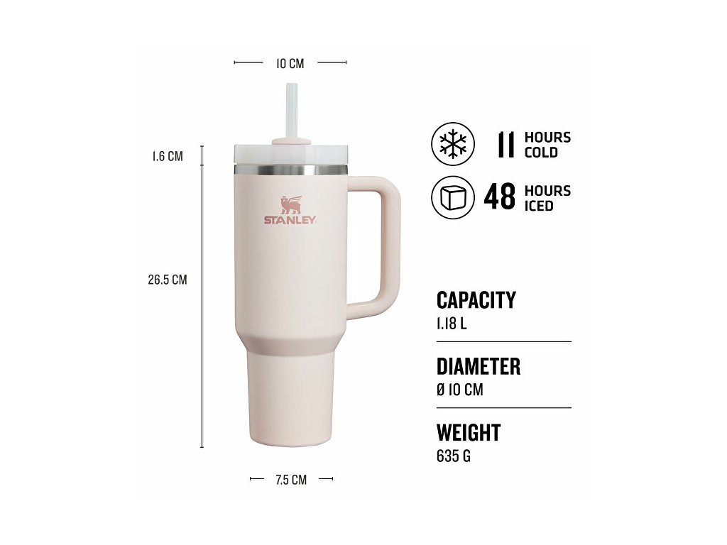 Nerezový termohrnek Quencher ve světle růžové barvě - must have, velký, odolný, krásný, trendy, pro každou příležitost, stylový. Dobře uchopitelný, jemný povrch, nabízí stylový, sofistikovaný vzhled a hřejivý, sametový pocit. Přesto jej lze mýt v myčce nádobí a má veškerou odolnost, na kterou se u značky Stanley 1913 můžete spolehnout. Pod jedinečným povrchem Soft Matte se skrývá konstrukce z recyklované nerezové oceli a dvoustěnná vakuová izolace. V horní části se naleznete patentové víčko FlowState™ s otočným krytem se třemi polohami: polohu otvoru pro brčko navržený tak, aby zamezil vyšplíchnutí obsahu, včetně speciálního těsněním, které drží opakovaně použitelné brčko na místě otvor pro pití nápoje přímo celoplošný kryt pro větší odolnost proti vyšplíchnutí a vytečení tekutiny, které ale nezabrání vytečení obsahu, pokud není termohrnek ve svislé poloze