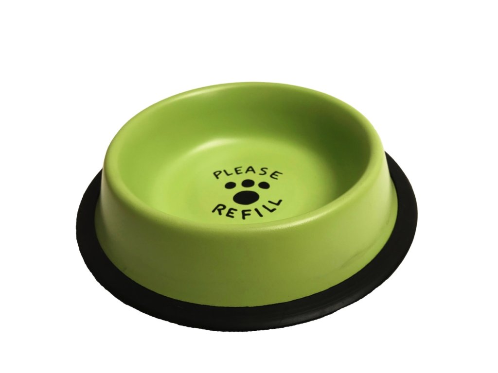 Pastelově zelená nerezová miska s nápisem na dně. Miska je opatřena gumovým kroužkem, aby byla stabilní a neklouzala po podlaze.