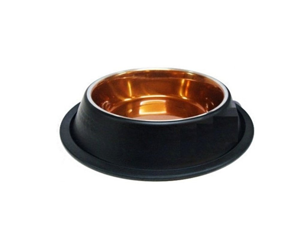 Nerezová miska ve velmi netradičním vzhledu. Kombinace černé barvy na vnější straně a měděné uvnitř je netradiční a zajímavá. Spodní okraj je opatřen gumou, aby miska neklouzala po podlaze.