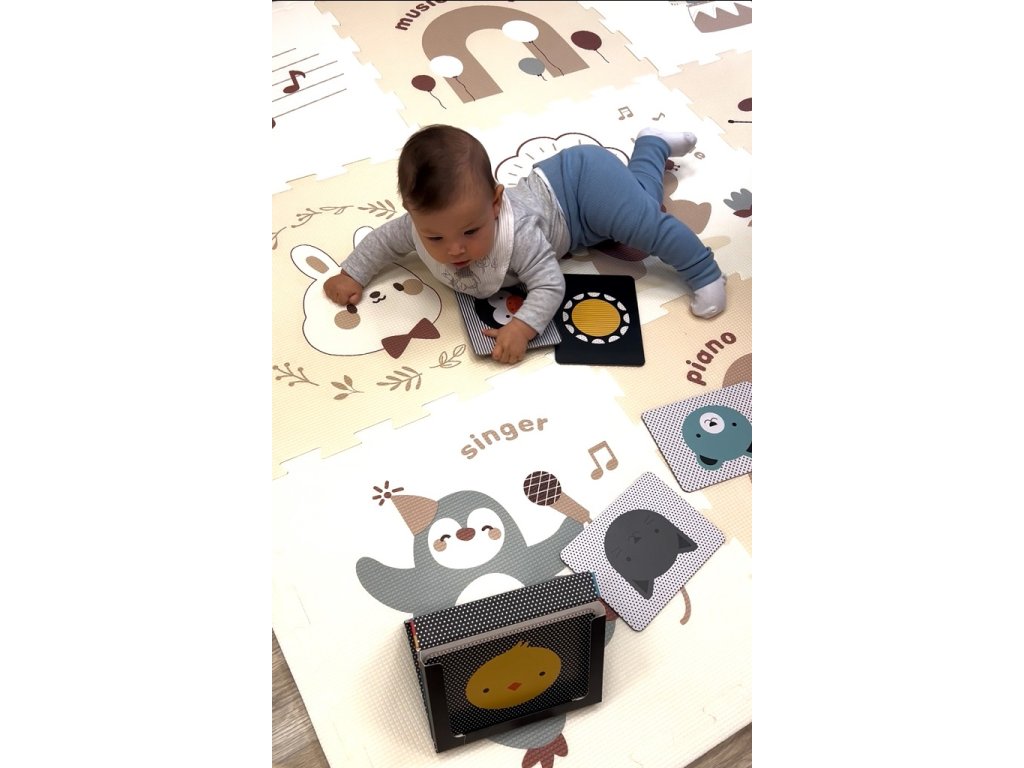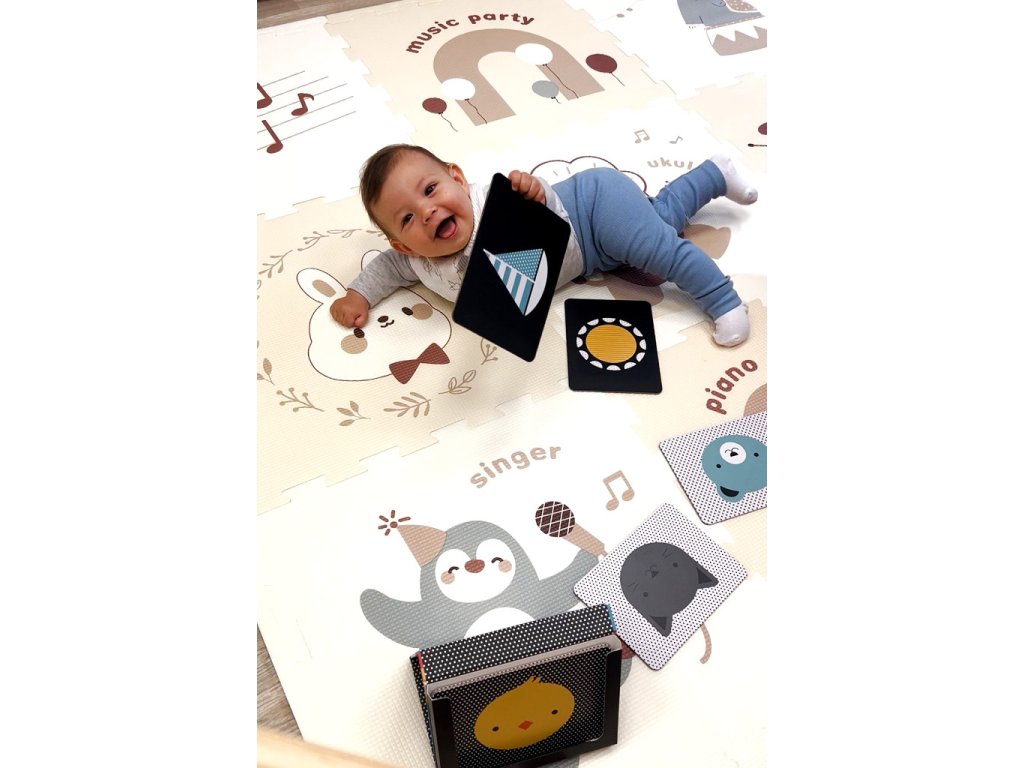 Hrací pěnová podložka se skládá z 9 čtverců se snadno spojí do praktické a pohodlné plochy pro hraní o velikosti 180x180 cm. Podložka je vyrobena z měkkého a bezpečného materiálu, který poskytuje dětem pohodlí a ochranu při pohybu na zemi. Na jednotlivých dílech jsou roztomilá zvířátka stylizovaná jako hudebníci, obklopená motivy hudby a notami, které podporují dětskou představivost a radost z objevování. Podložka je ideální pro domácí použití a pomáhá rozvíjet smyslové vnímání i kreativitu. Kombinace přírodních tónů v kombinaci s bílou barvou spolu s kvalitním provedením dělají z této podložky pěkný doplněk každého pokojíčku nebo herny. Hlavní vlastnosti: 9 čtvercůměkký a bezpečný pěnový materiálsnadné spojování jednotlivých dílůmotiv hudby a zvířátek jako hudebníkůpodporuje smyslové vnímání a kreativituvhodné pro děti od 6 měsícůDoplňkové parametry