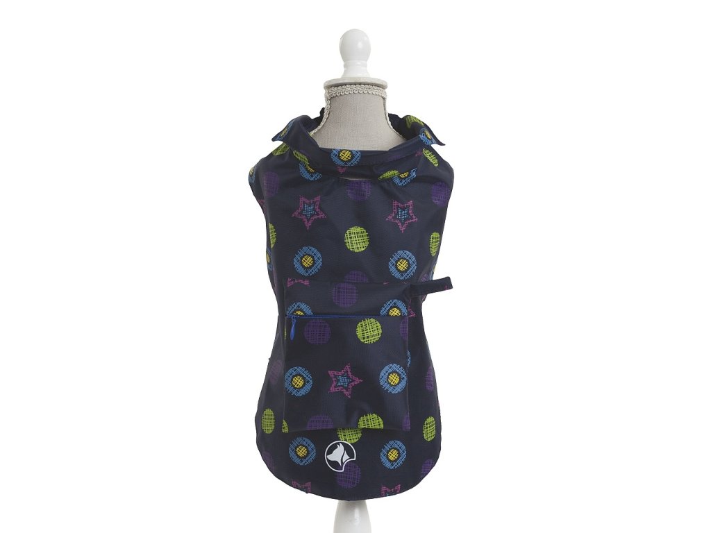 Stylová a praktická pláštěnka ochrání vašeho pejska během deštivého počasí a zároveň mu dodá elegantní vzhled. Modrý podklad s jemným motivem koleček a hvězd působí moderně a hravě, takže váš mazlíček bude zářit i v pošmourných dnech.