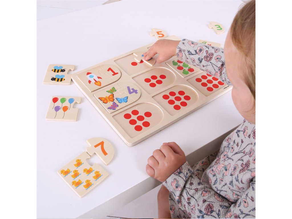 Vaši malí zvědavci budou určitě milovat tohle malé, zajímavé a chytré puzzle. Nejen, že je bude bavit třídit kousky do správných míst, ale mohou vkládat jen samotné obrázky a k nim pak přiřadit ta správna čísla. Každý kousek dřevěné skládačky je dimenzovaný tak, aby usnadnil zvedání, uchopení v malé dětské ručičce. Puzzle jsou potištěny obrázky nebo barvami, které napomáhají procesu učení a dodávají vzdělávací hodnotu. Skvělý způsob, jak rozvíjet obratnost, rozpoznávání tvarů, koncentraci a počítání již od útlého věku. Hlavní vlastnosti: vyrobeno z vysoce kvalitních materiálů ze zodpovědných zdrojůodpovídá současným evropským bezpečnostním normámDoplňkové parametry