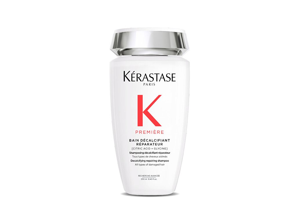 Šampon Kérastase Premiére Bain Décalcifiant Réparateur jemně čistí pokožku hlavy a zároveň z vlasů účinně odstraňuje nahromaděný vápník, který přispívá k jejich lámavosti a ztrátě pružnosti. Poškozené vlasy jsou kvůli vyšší poréznosti náchylnější k absorpci minerálů z vody, což narušuje jejich strukturu a činí je matnými a nepoddajnými. Díky 8% organické kyselině citronové šampon efektivně uvolňuje vápník z povrchu i vnitřku vlasů, zatímco aminokyselina glycin pomáhá obnovit keratinové vazby a posiluje vlasy zevnitř. Výsledkem je hladší, pevnější a viditelně zdravější vlasové vlákno. Jeho bohatá krémová textura se promění v jemnou pěnu s příjemnou vůní citrusů, jasmínu a dřevitých tónů.