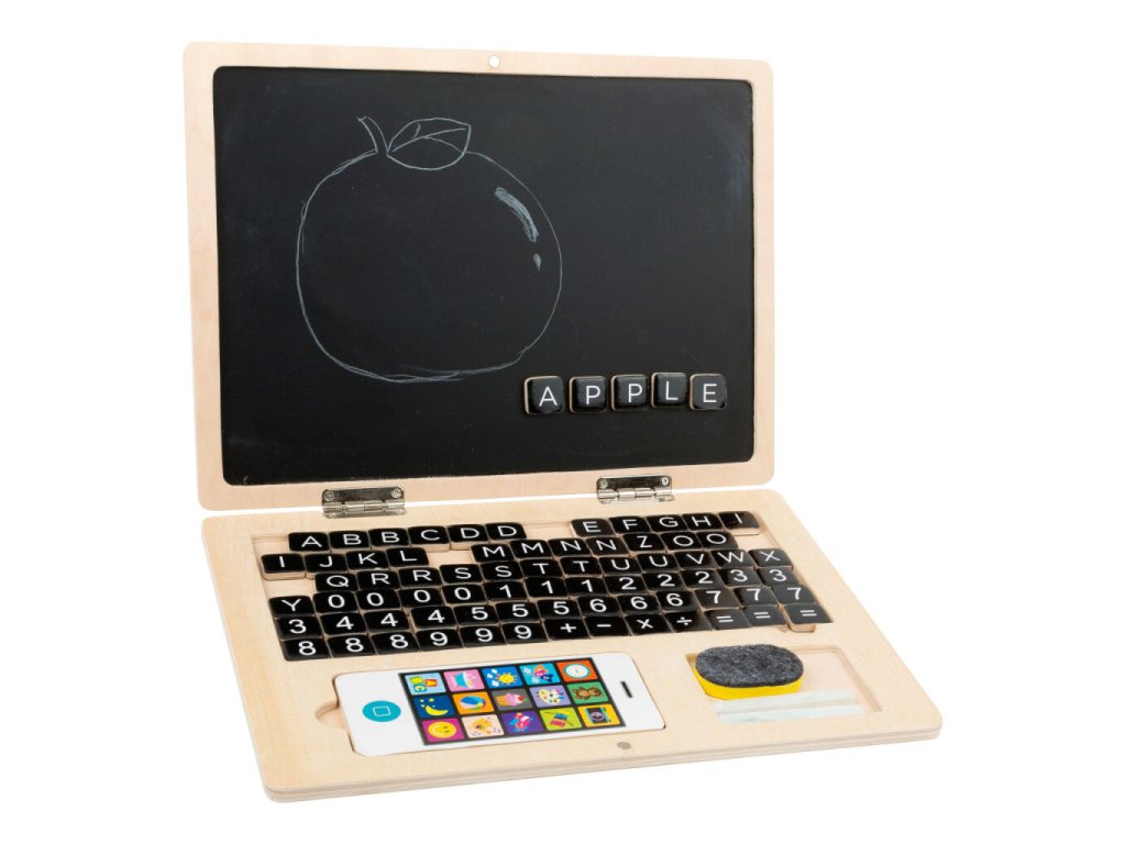 Pište na klávesnici stejně jako dospělí! S tímto dřevěným notebookem můžou mladí počítačoví nadšenci získat první zkušenosti s IT. Dílky s písmenky, čísly a znaky mohou děti jednoduše přesouvat a vytvářet tak slova nebo řešit matematické problémy a to na magnetické destičce – displeji notebooku. Křídou pak děti mohou kreslit obrázky nebo psát slova, které jednoduše smyjí houbičkou. V balení je také dřevěný smartfon. Notebook lze jednoduše přemísťovat a přepravovat díky jeho kompaktní velikosti. Balení obsahuje 83 dílů.